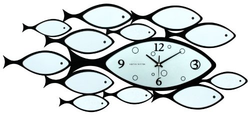 Wall Clock - Under, The contemporary style of the black matte with the various sizes of frosted glass makes this wall clock so unique. It has a wooden case supports the glass cut outs of the fish. A school of differently sized fish swims across the wall while telling the time. The dial has black numbers making it easy to read against the white background. Details Requires one AA battery. Size: 31" L x 1" D x 14" Ht Processing/Shipping 2-3 Business Days + Shipping Time From TN